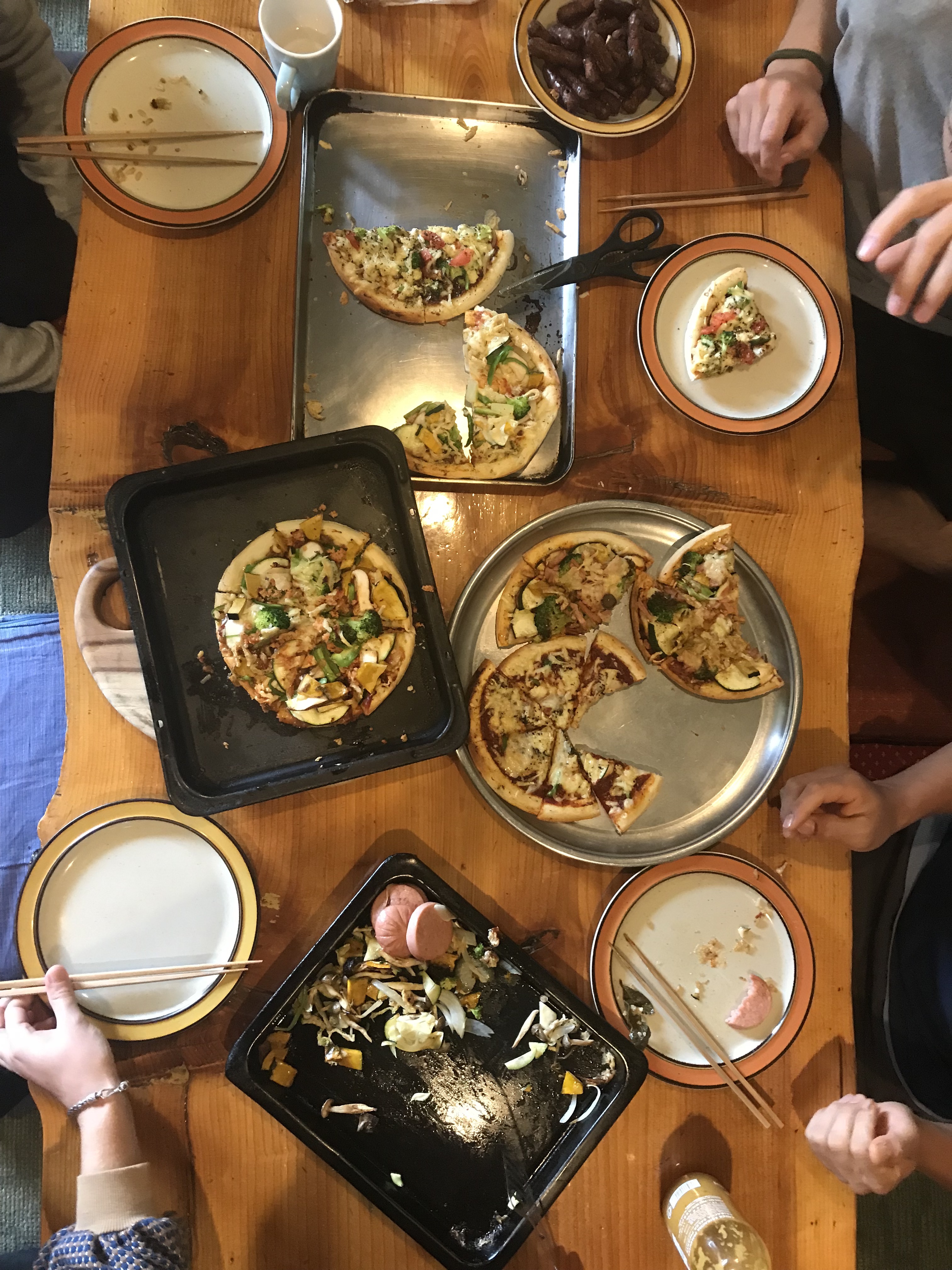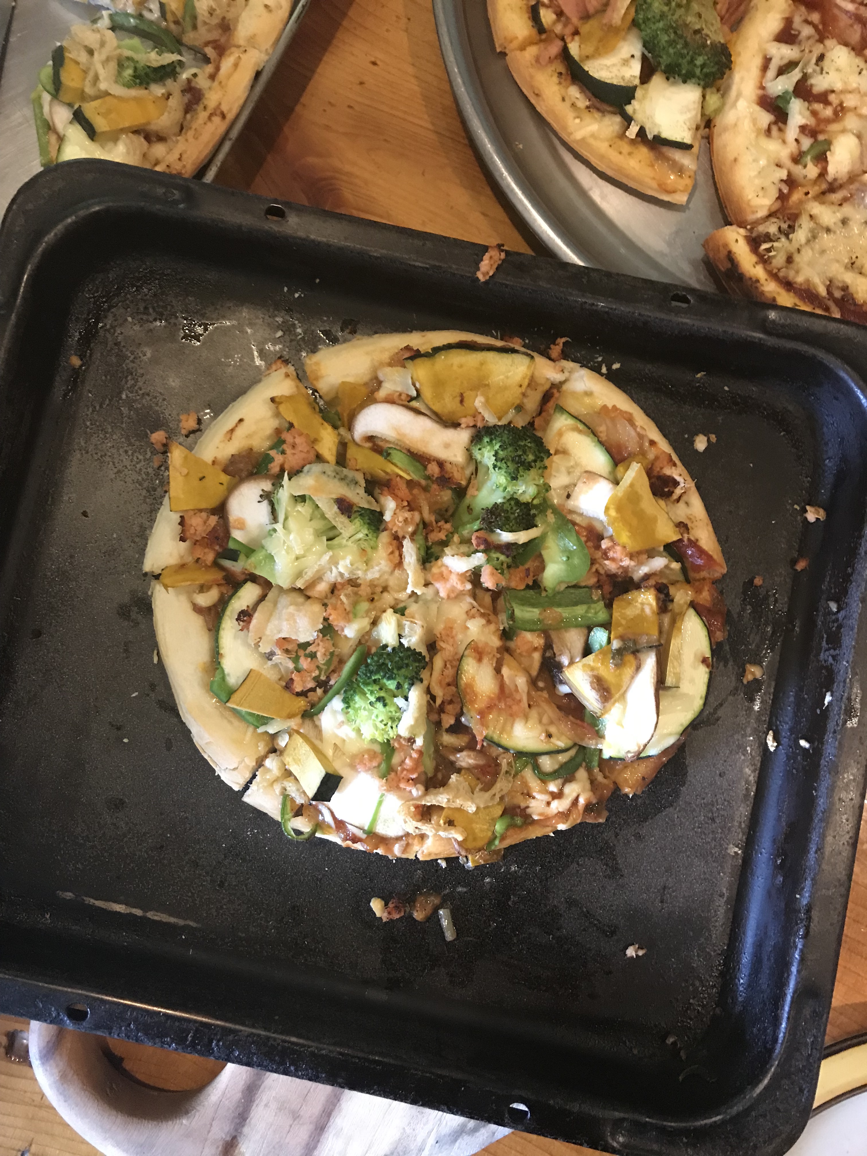 made our own pizzas for lunch~ ft. mine with zucchini, mushrooms, pumpkin, tomato sauce, cheese, salmon, and who knows what else but i can tell you it was delicious