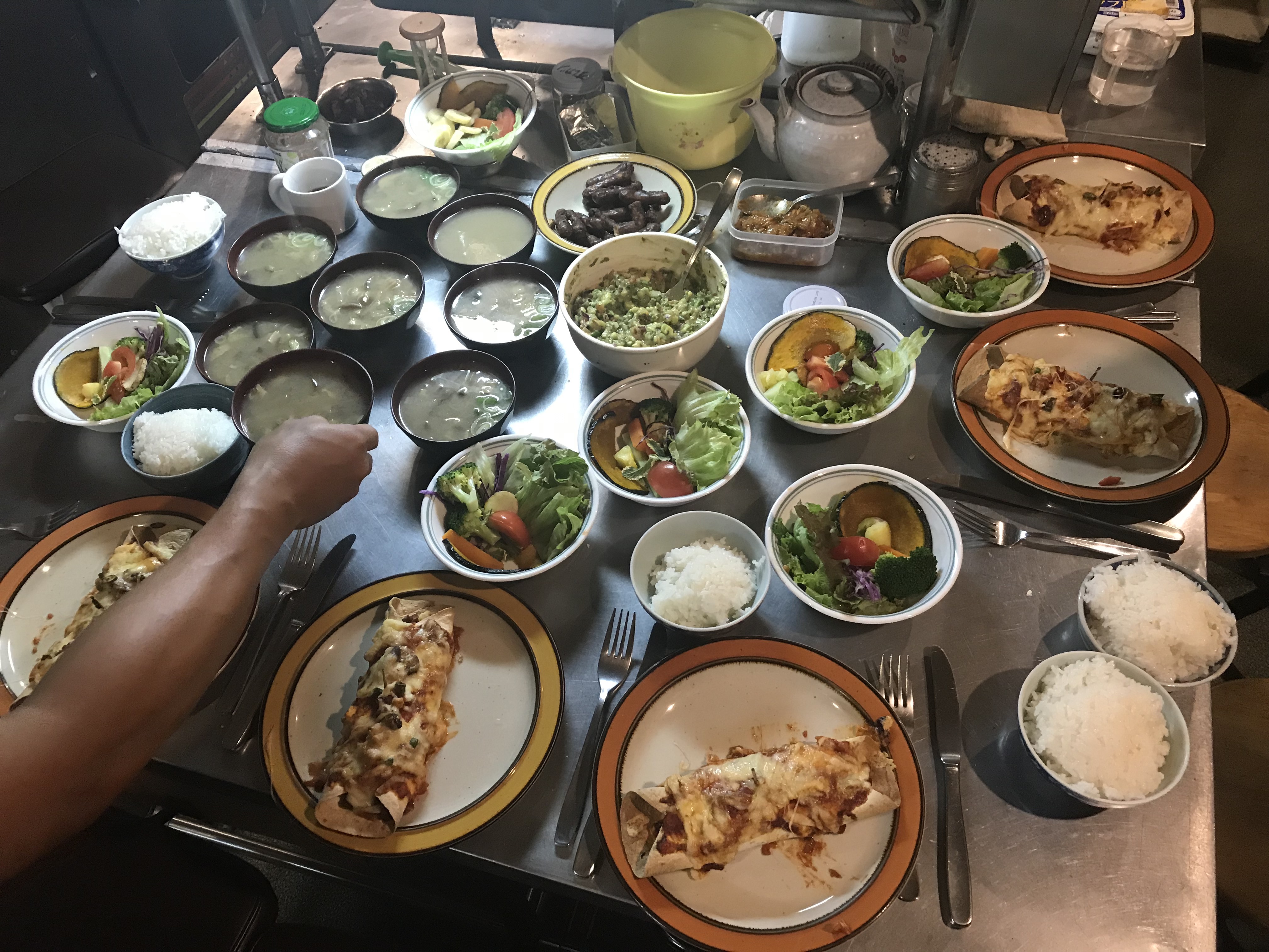 me (trying to) follow instructions to make bread + our enchilada, miso soup (plus another staff’s mushrooms from her backyard!!), yum salad, guac (god i love guac), rice… i am fed so well here bless