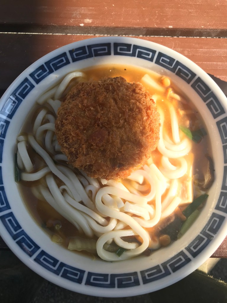 some minced pork?/flour?/onion? cutlet + curry udon lunch, first time K. made noodles for us (for main dish)!