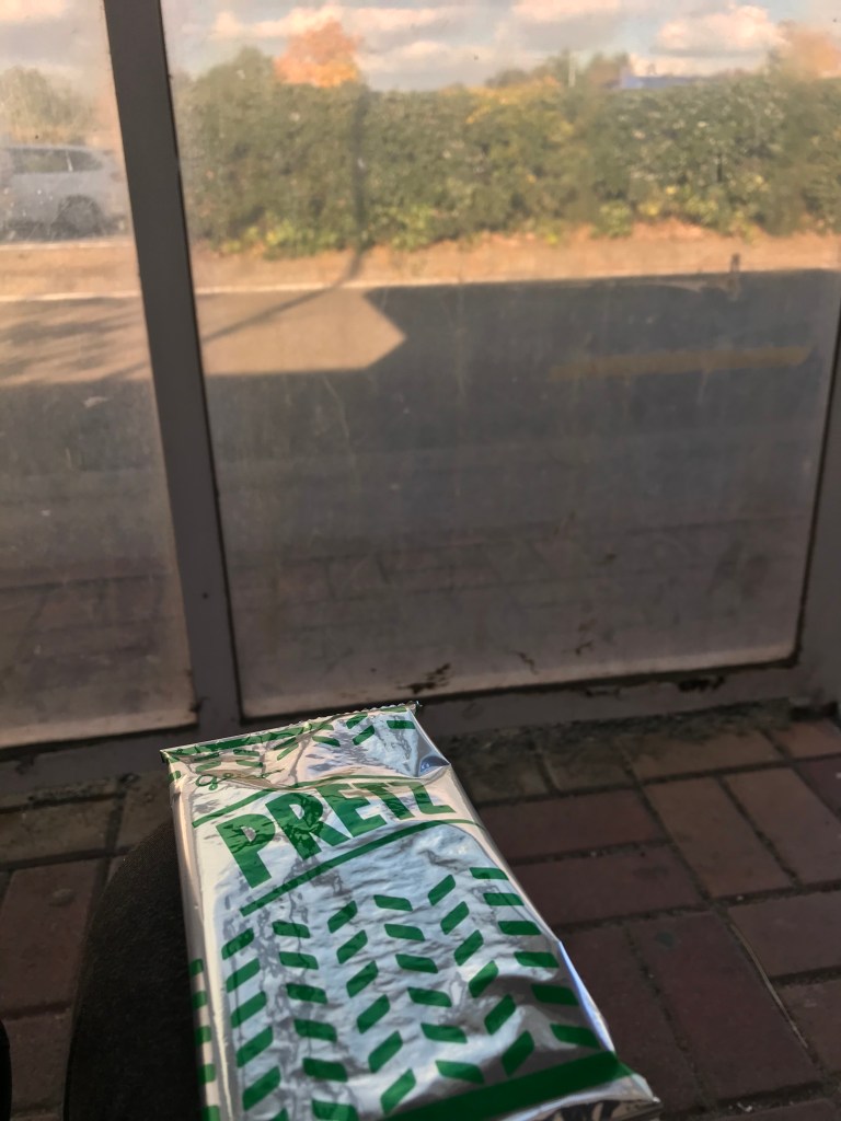 2.5 late bus, got my pretz out (aka late lunch/emergency snack), offered some to the lady sitting next to me who earlier confirmed that the bus that came earlier wasn’t my bus and my bus is just real late; thank god for having data therefore using my laptop