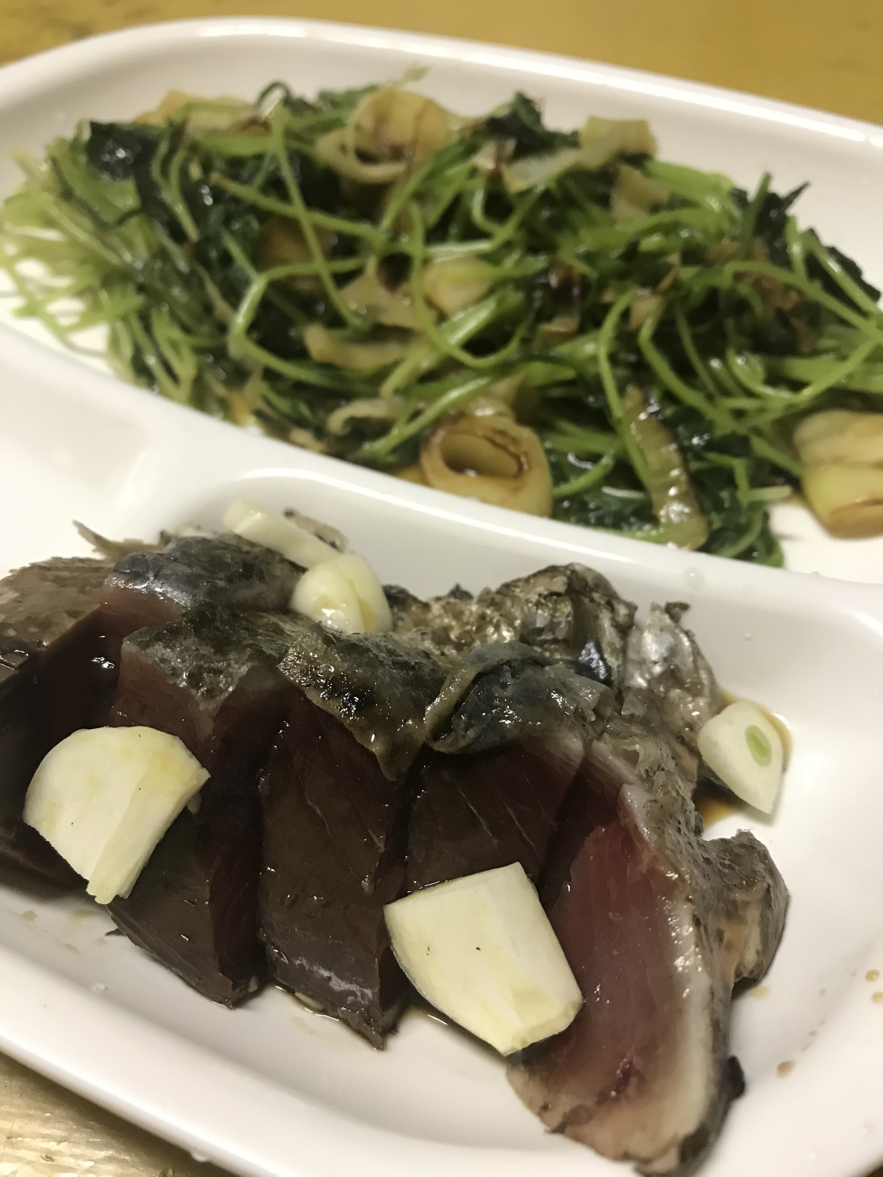 dinner: the teabag of genmaicha which i’m pretty sure Yさん said the tea grower is his friend, tatake sashimi with raw garlic and ponzu as Yさん recommended, garlic and bean sprouts + spinach stirfry (from which i reminded myself not to use too many flavorings at once oops- ginger/leek/garlic oops)